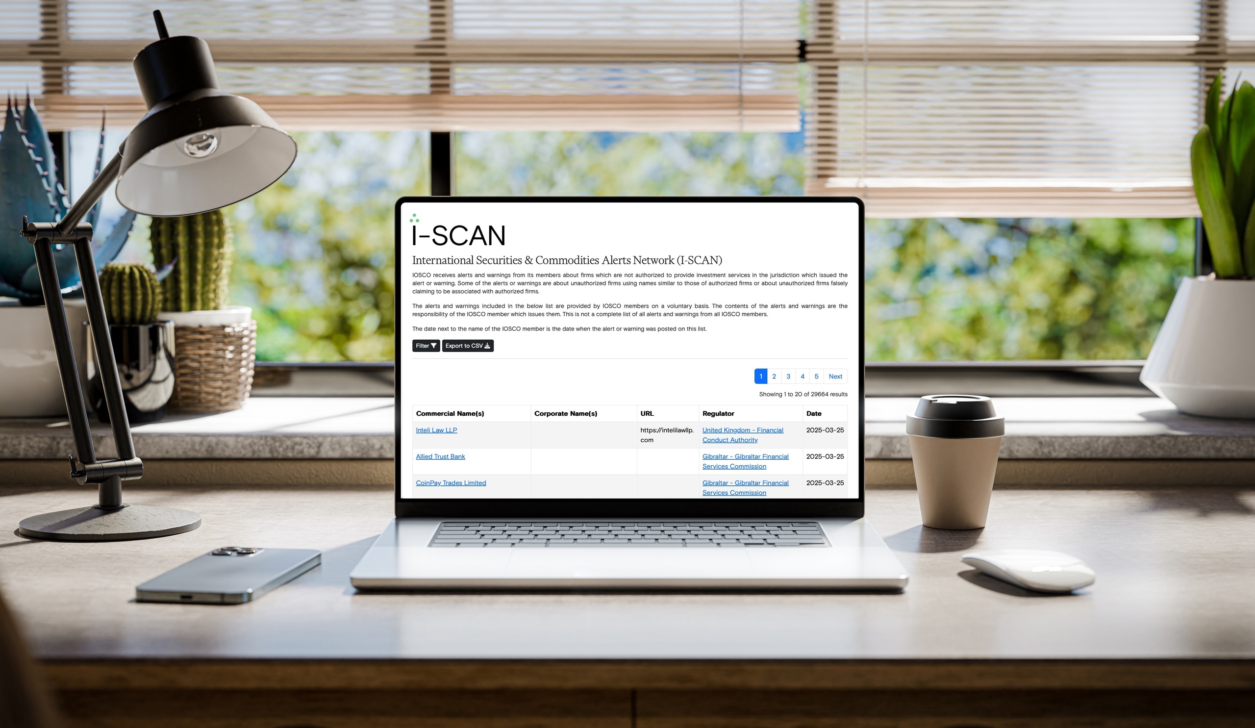 I-SCAN es una plataforma online que permite consultar, en tiempo real, las alertas sobre entidades no autorizadas (chiringuitos financieros) publicadas por más de 150 supervisores financieros de todo el mundo. Aquí se puede encontrar la entidad advertida, web o dominio, la fecha de emisión de la advertencia y el miembro de la IOSCO (el regulador de cada país) que la ha emitido.
